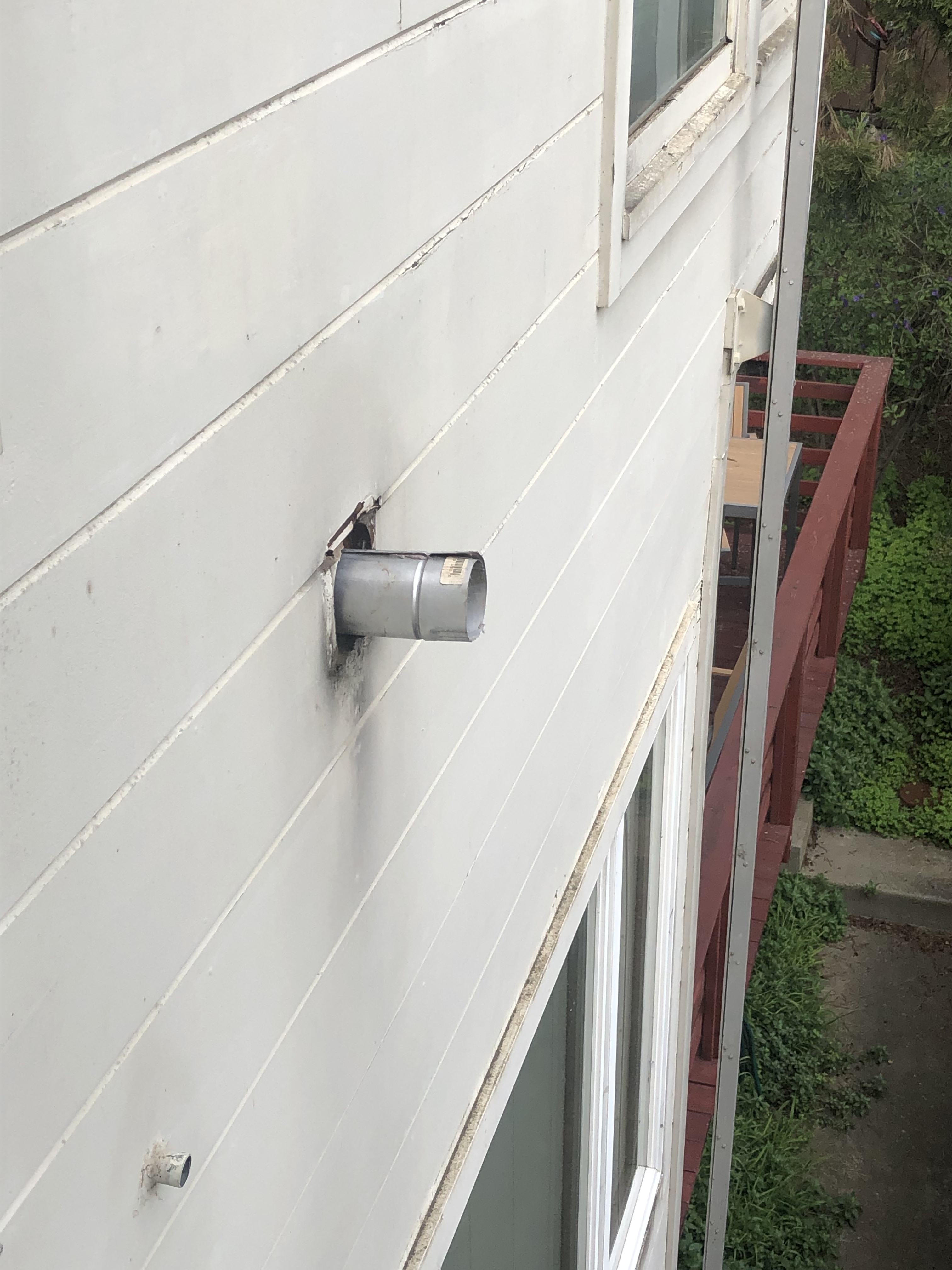 Dryer vent pipe protruding from laundry room wall after poorly executed dryer repair.