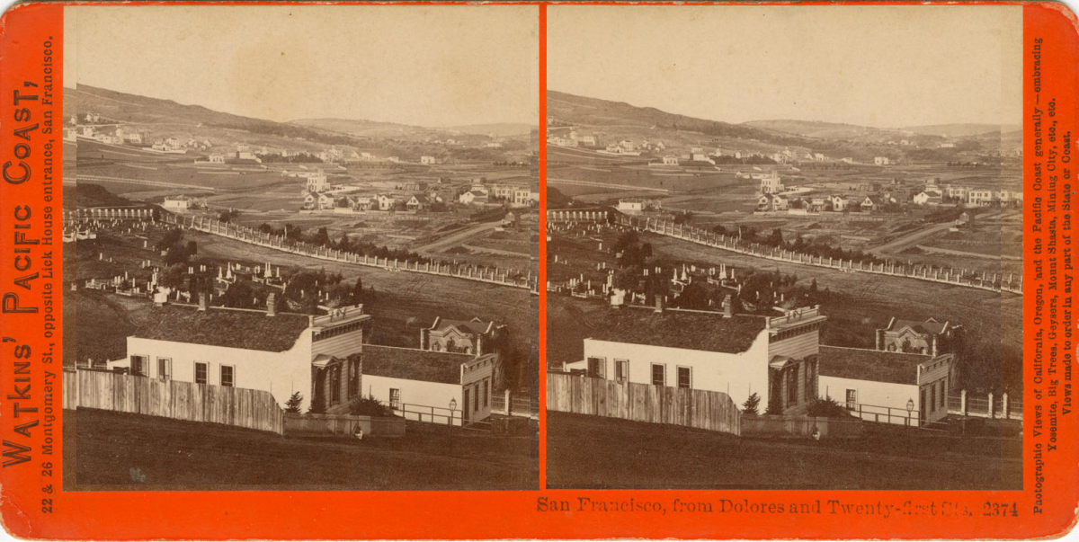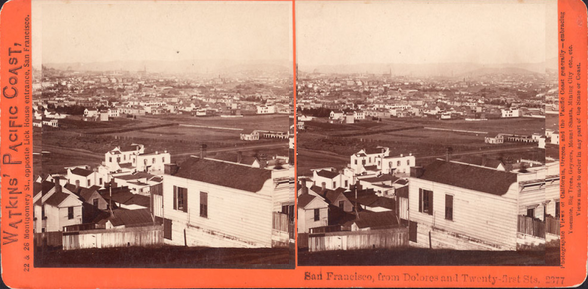 Watkins stereoview #2374 looks northwest from Dolores/21st toward Corona Heights.