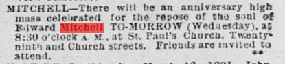 | 03/17/1891 | anniversary mass for Edward Mitchell d. 3/18/1890 |