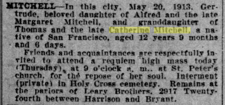 | 05/22/1913 | funeral notice Thomas Mitchell's granddaughter |